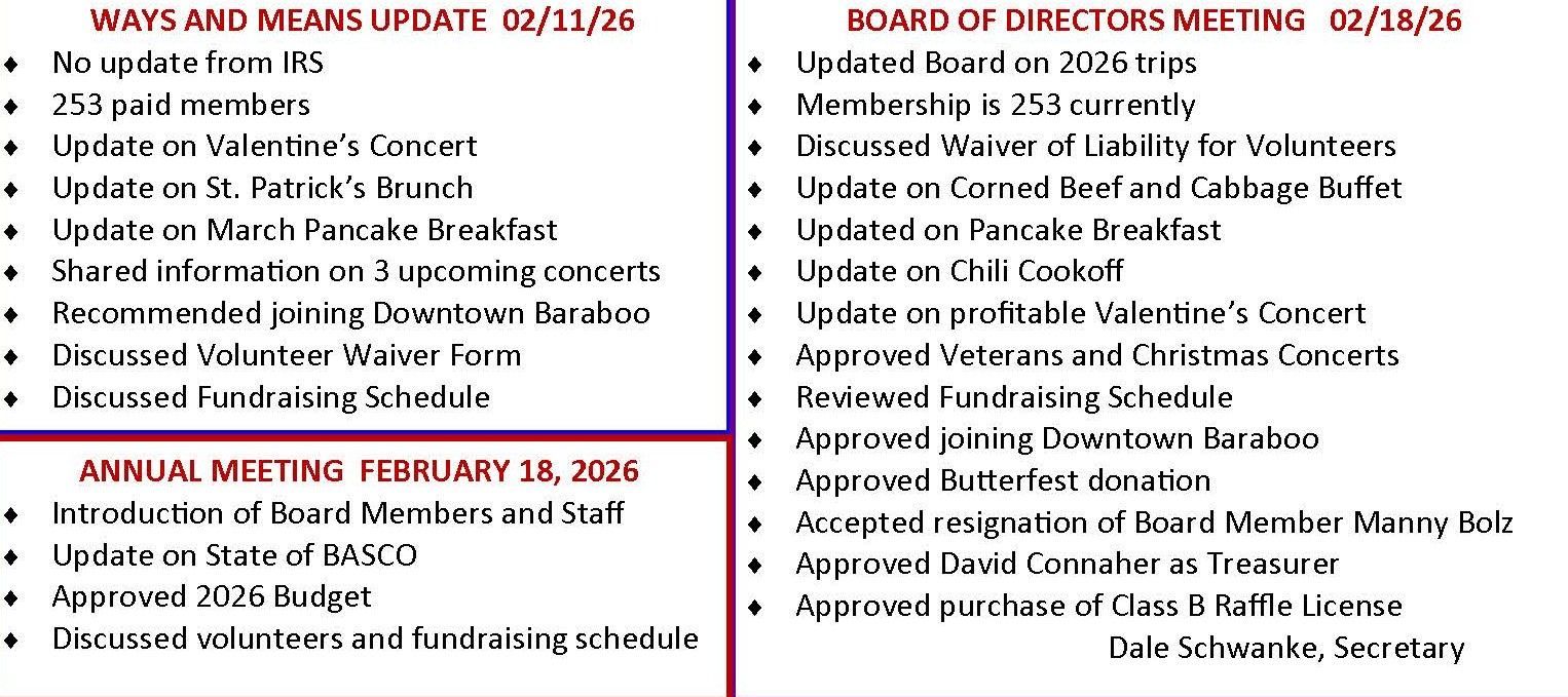 BASCO Board meetings on the 3rd Wednesday each month at 10:30am.