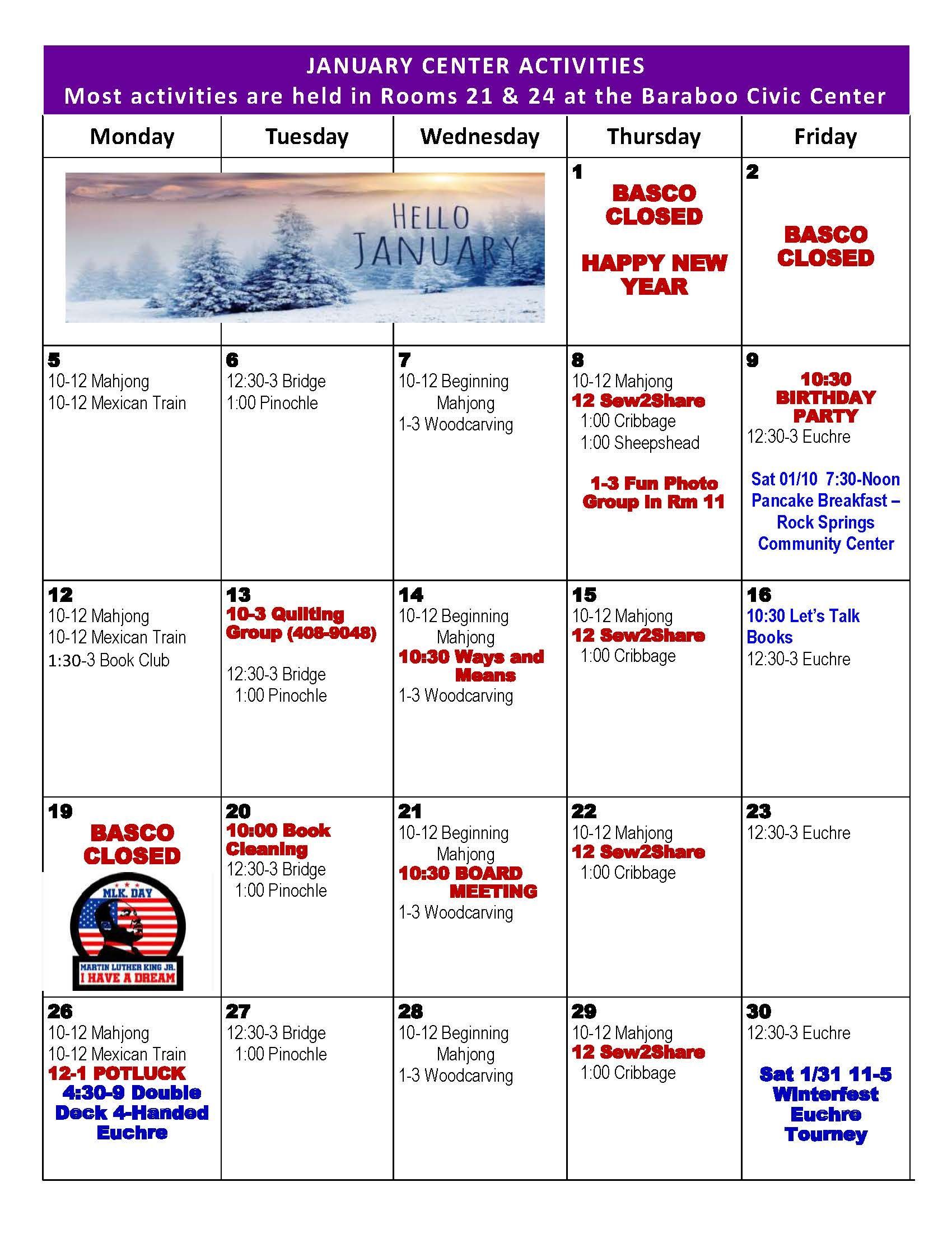*Most activities are held in Rooms 21 & 24 at the Baraboo Civic Center.