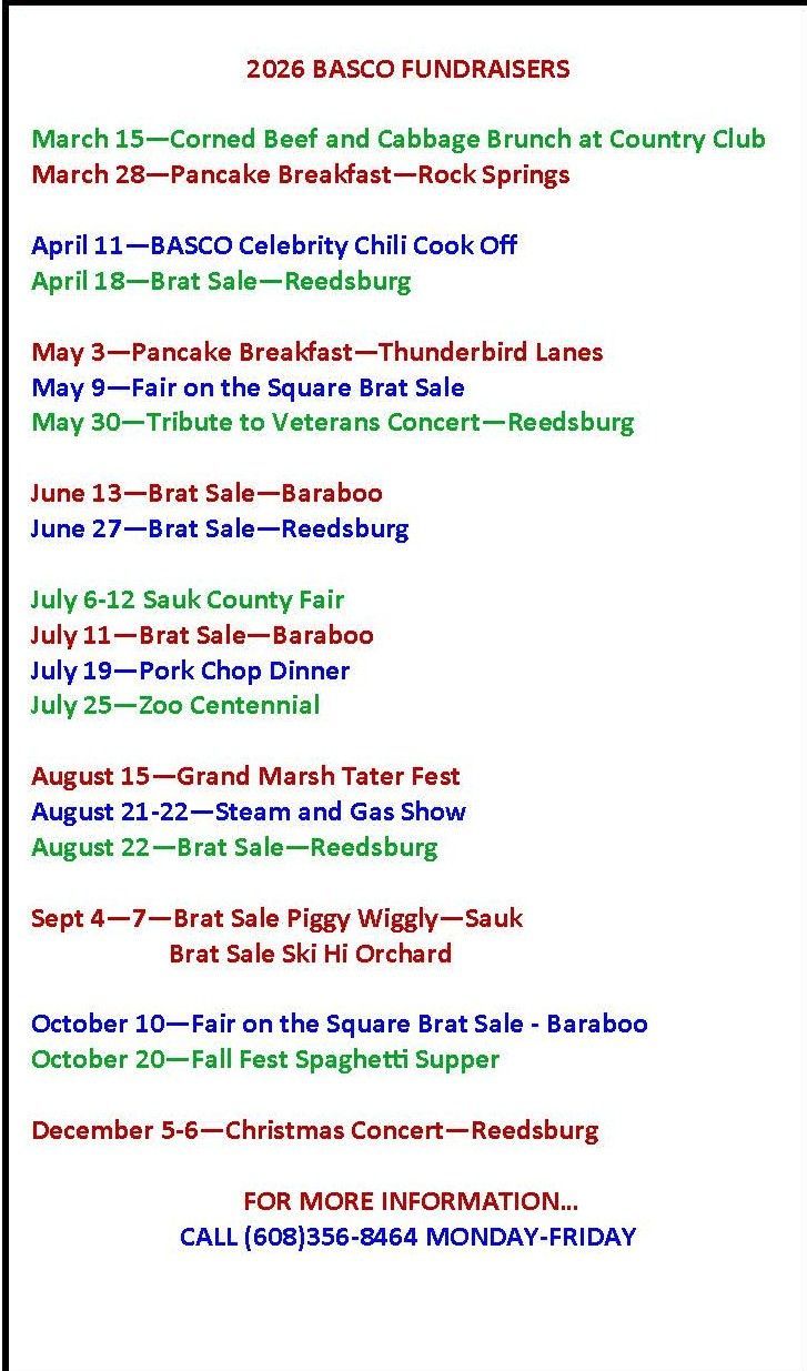 *All dates and events are tentative. Volunteers are often needed to help prepare food, set up, clean up, and work at the sites. Watch for volunteer sign-up sheets at BASCO 2-3 weeks prior to each event.